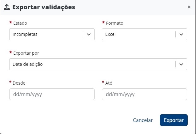 * Pode exportar as validações *Incompletas*, após a [aplicação de regras](https://docs.pepdata.com/a-aplicacao/validacoes/aplicacao-de-regras) e uma primeira tentativa de [verificação manual](https://docs.pepdata.com/a-aplicacao/validacoes/analise-manual), de forma a saber os casos em que precisa de obter mais informação.